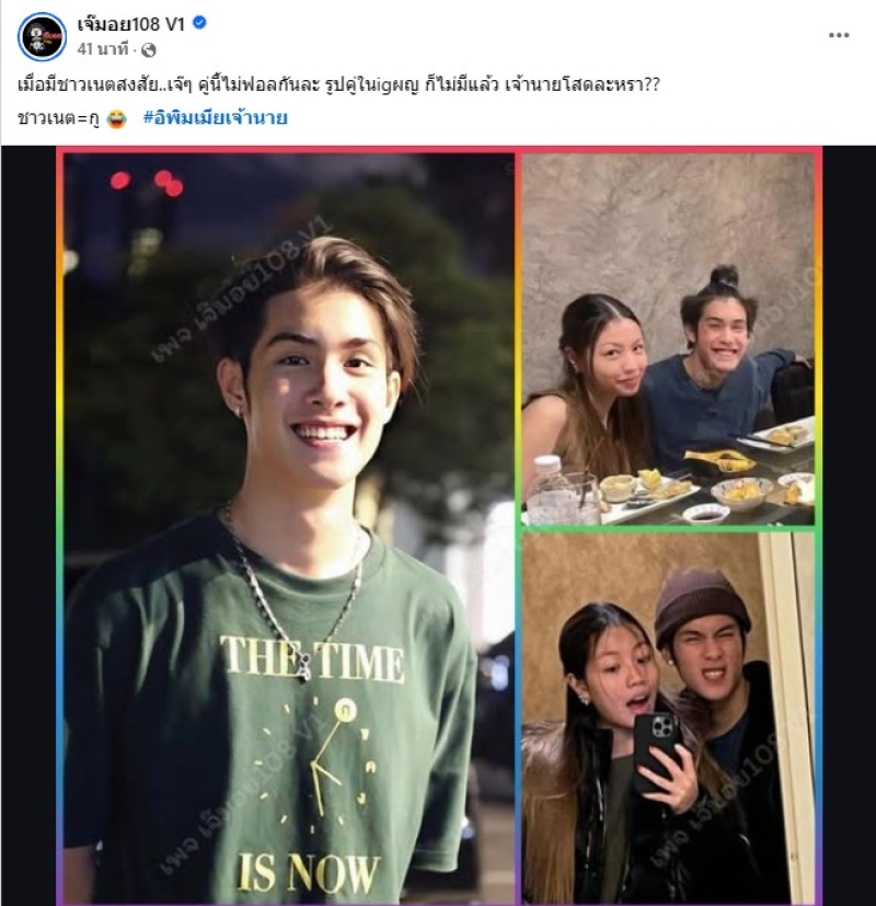 จากกรณที่ก่อนหน้านั้น ทางเพจดัง เจ๊มอย108 V1 ได้ออกมาโพสต์ประเด็น จับตาความสัมพันธ์ของคู่รัก อย่าง เจ้านาย จินเจษฎ์ กับแฟนสาวนอกวงการ ที่เคยหวานจนน่าอิจฉากัน โดยในโพสต์ได้เผยว่า เมื่อมีชาวเนตสงสัย..เจ๊ๆ คู่นี้ไม่ฟอลกันละ รูปคู่ในigผญ ก็ไม่มีแล้ว เจ้านายโสดละหรา?? ชาวเนต=กู