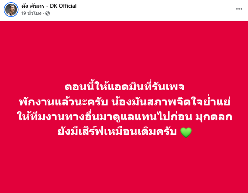 จนเกิดการแสวิพากษ์วิจารณ์กันอย่างมาก ทั้งนี้ทางด้านนักร้อง ดัง พันกร ได้ออกมาแจ้งว่า ตอนนี้ให้แอดมินที่รันเพจ พักงานแล้วนะครับ น้องมันสภาพจิตใจย่ำแย่ ให้ทีมงานทางอื่นมาดูแลแทนไปก่อน มุกตลกยังมีเสิร์ฟเหมือนเดิมครับ