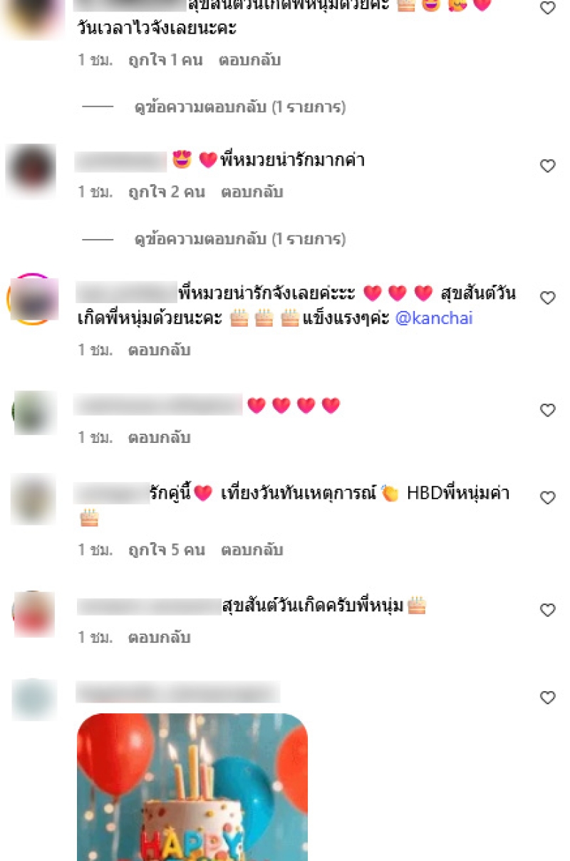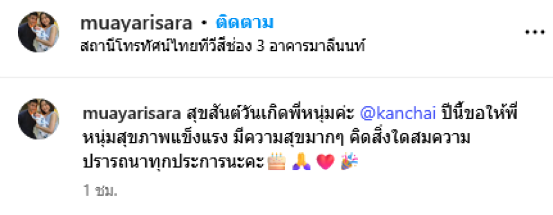 พร้อมเขียนแคปชั่นระบุว่า สุขสันต์วันเกิดพี่หนุ่มค่ะ @kanchai ปีนี้ขอให้พี่หนุ่มสุขภาพแข็งแรง มีความสุขมากๆ คิดสิ่งใดสมความปรารถนาทุกประการนะคะ ท่ามกลางแฟนๆต่างเข้ามาคอมเมนต์อวยพรกันอย่างมาก