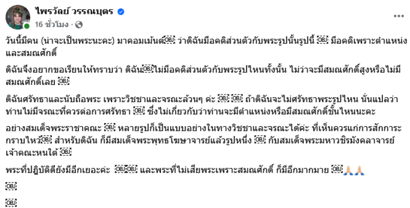 จากประเด็นข่าวฉาวในวงการสงฆ์ที่กำลังเป็นประเด็นร้อนในตอนนี้ โดยมีคนดังเเละอินฟลูต่างออกมาพูดถึงกันอย่างมาก รวมถึง แพรรี่ ไพรวัลย์ วรรณบุตร โดยล่าสุด แพรรี่ ได้ออกมาชี้แจง หลังถูกกล่าวหาว่ามีอคติกับพระ ผ่านทางเฟซบุ๊คไพรวัลย์ วรรณบุตร ระบุว่า