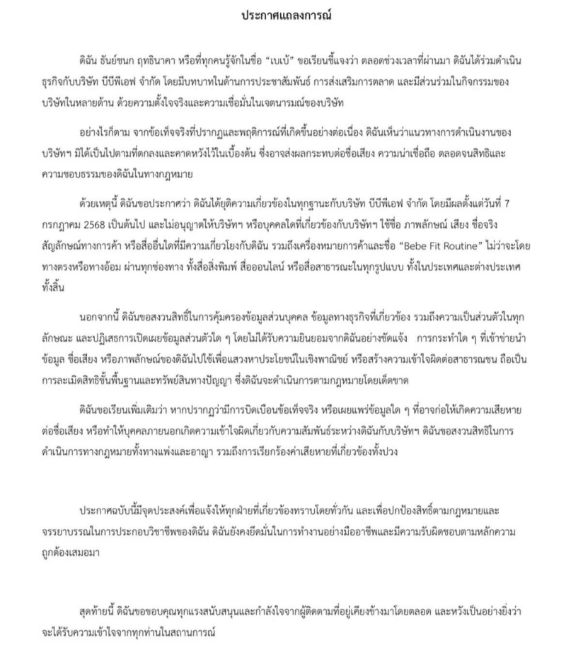 เรียกได้ว่า หลายคนคงรู้จักกันเป็นอย่างดี กับ เบเบ้ ธันย์ชนก ฤทธินาคา ล่าสุด เธอ ได้โพสต์แถลงการณ์ผ่านอินสตราแกรม thisisbebe เกี่ยวกับการยุติความเกี่ยวข้องกับบริษัท บีบีพีเอฟ จำกัด มีผลตั้งแต่วันที่ 7 กรกฎาคม 2568 เป็นต้นไป