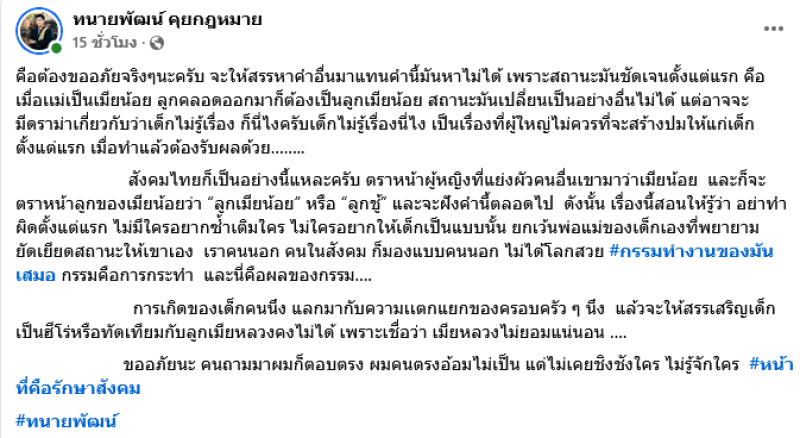 จากกรณีที่ทางด้าน ทนายพัฒน์ ได้ออกมาโพสต์ข้อความทางเฟซบุ๊ค ทนายพัฒน์ คุยกฎหมาย ระบุว่า คือต้องขออภัยจริงๆนะครับ จะให้สรรหาคำอื่นมาแทนคำนี้มันหาไม่ได้ เพราะสถานะมันชัดเจนตั้งแต่แรก คือ เมื่อเเม่เป็นเมียน้อย ลูกคลอดออกมาก็ต้องเป็นลูกเมียน้อย สถานะมันเปลี่ยนเป็นอย่างอื่นไม่ได้