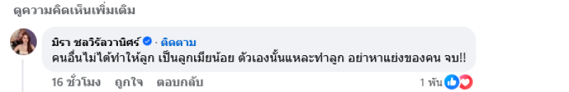 ทั้งนี้ เอ๋มิรา อดีตภรรยาสาวของ ครูไพบูลย์ ได้คอมเมนต์ทันทีว่า คนอื่นไม่ได้ทำให้ลูก เป็นลูกเมียน้อย ตัวเองนั้นแหละทำลูก อย่าหาแย่งของคน จบ!!