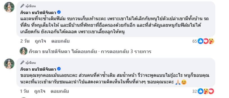 และคนที่จะซ้ำเติมฟิล์ม รบกวนเก็บเท้านะคะ เพราะเขาไม่ได้เลิกกับหนูไปตัวเปล่าเขามีทั้งบ้าน รถ ที่ดิน ที่หนูเต็มใจให้ และมีบ้านที่พัทยาที่ถือครองด้วยกันอีก และที่สำคัญเลยหนูกับฟิล์มไม่ได้เกลียดกัน ยังเจอกันได้ตลอด เพราะเขาเลี้ยงลูกให้หนู