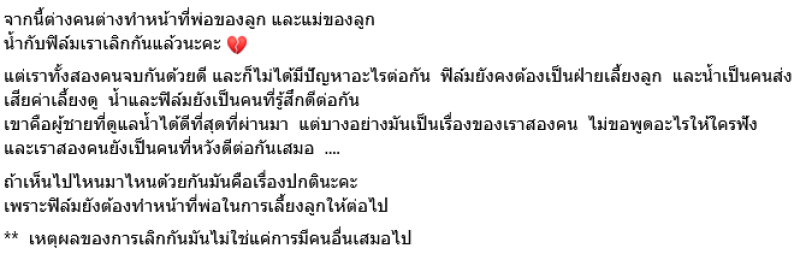 น้ำและฟิล์มยังเป็นคนที่รู้สึกดีต่อกัน เขาคือผู้ชายที่ดูแลน้ำได้ดีที่สุดที่ผ่านมา แต่บางอย่างมันเป็นเรื่องของเราสองคน ไม่ขอพูดอะไรให้ใครฟัง และเราสองคนยังเป็นคนที่หวังดีต่อกันเสมอ ถ้าเห็นไปไหนมาไหนด้วยกันมันคือเรื่องปกตินะคะ เพราะฟิล์มยังต้องทำหน้าที่พ่อในการเลี้ยงลูกให้ต่อไป เหตุผลของการเลิกกันมันไม่ใช่แค่การมีคนอื่นเสมอไป