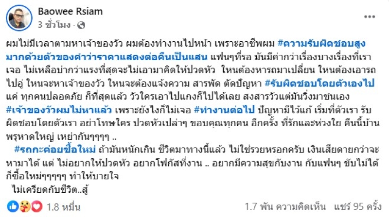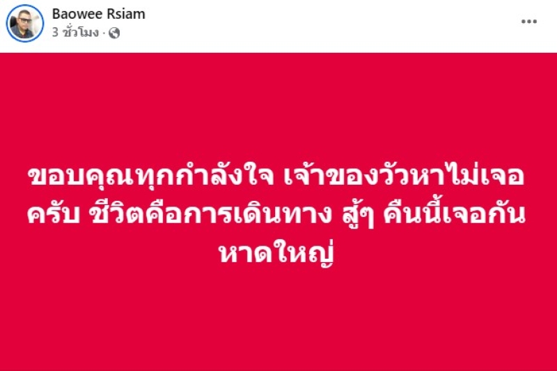 ล่าสุด ทางบ่าววี ก็ได้ออกมาอัปเดตว่า ผมไม่มีเวลาตามหาเจ้าของวัว ผมต้องทำงานไปหน้า เพราะอาชีพผม #ความรับผิดชอบสูงมากด้วยตัวของคำว่าราคาแสดงต่อคืนเป็นแสน แฟนๆที่รอ มันมีค่ากว่าเรื่องบางเรื่องที่เราเจอ ไม่เหลือบ่ากว่าแรงที่สุดจะไม่เอามาคิดให้ปวดหัว ใหนต้องหารถมาเปลี่ยน ใหนต้องเอารถไปอู่ ใหนจะหาเจ้าของวัว ใหนจะต้องแจ้งความ สารพัด ตัดปัญหา #รับผิดชอบโดยตัวเองไป แค่ ทุกคนปลอดภัย ก็ที่สุดแล้ว วัวใครเอาไปแกงก็ไปได้เลย สงสารวัวแต่มันวิ่งมาชนเอง #เจ้าของวัวผมไม่หาแล้ว เพราะยังไงก็ไม่เจอ #ทำงานต่อไป ปัญหามีไว้แก้ เริ่มที่ตัวเรา รับผิดชอบโดยตัวเรา อย่าโทษใคร ปวดหัวเปล่าๆ ขอบคุณทุกคน อีกครั้ง ที่รักและห่วงใย คืนนี้บ้านพรุหาดใหญ่ เหย่ากันๆๆๆๆ