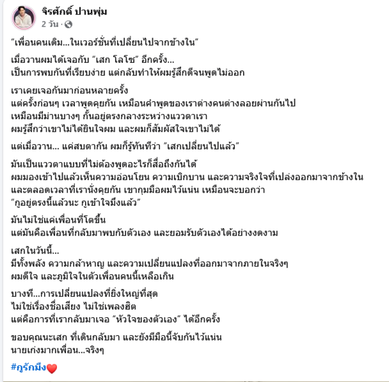 เสกในวันนี้... มีทั้งพลัง ความกล้าหาญ และความเปลี่ยนแปลงที่ออกมาจากภายในจริงๆ ผมดีใจ และภูมิใจในตัวเพื่อนคนนี้เหลือเกิน บางที การเปลี่ยนแปลงที่ยิ่งใหญ่ที่สุด ไม่ใช่เรื่องชื่อเสียง ไม่ใช่เพลงฮิต แต่คือการที่เรากลับมาเจอหัวใจของตัวเองได้อีกครั้ง ขอบคุณนะเสก ที่เดินกลับมา และยังมีมือนี้จับกันไว้แน่น นายเก่งมากเพื่อน...จริงๆ #xูรักxึง