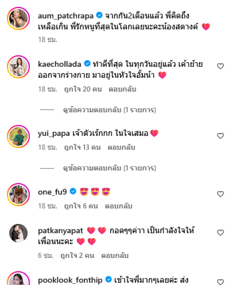 พร้อมกับเขียนแคปชั่นว่า จากกัน2เดือนแล้ว พี่คิดถึงเหลือเกิน พี่รักหนูที่สุดในโลกเลยนะคะน้องสตางค์ ท่ามกลางคนในวงการต่างเข้ามาคอมเมนต์ให้กำลังใจกันอย่างล้นหลาม อาทิ ทำดีที่สุด ในทุกวันอยู่แล้ว เค้าย้ายออกจากร่างกาย มาอยู่ในหัวใจอั้มน้า,กอดๆๆค่าา เป็นกำลังใจให้เพื่อนนะคะ เป็นต้น