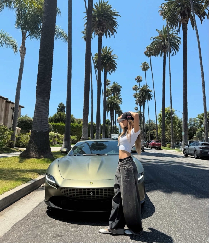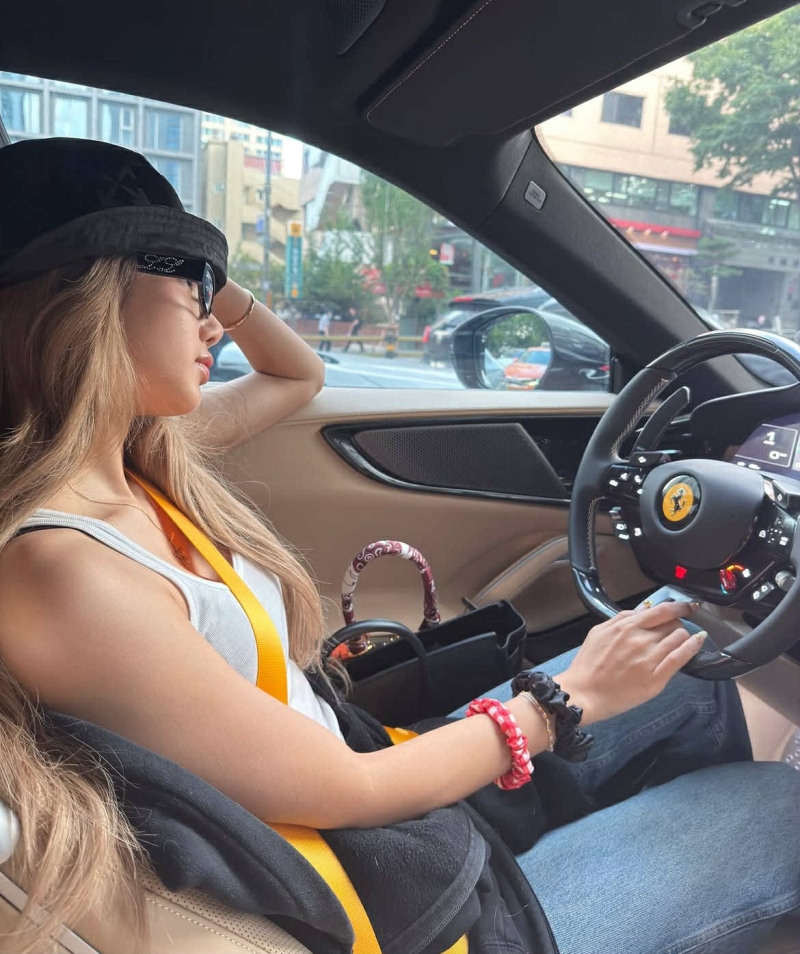 โดย ในภาพ ลิซ่า ใส่เสื้อครอปสีขาว และกางเกงขาบาน กับ Ferrari Roma คันหรู ที่อยู่เคียงข้าง โดย Ferrari Roma เป็นรุ่นยอดนิยมจากอิตาลี ผสมผสานดีไซน์คลาสสิก และความล้ำสมัยได้อย่างลงตัว