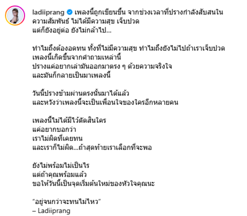 ซึ่งเลดี้ปรางได้เผยผ่านอินสตาแกรมว่า เพลงนี้ได้แรงบันดาลใจจากช่วงชีวิตที่สับสน เจ็บปวด แต่ยังเลือกจะ อยู่ ทั้งที่ใจไม่ได้สุข