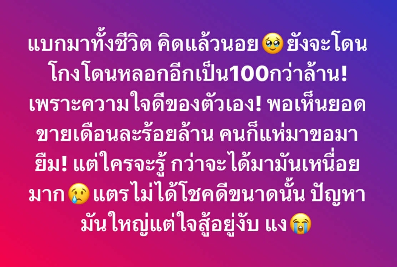 โดย มีข้อความว่า แบกมาทั้งชีวิต คิดแล้วนอย พอเห็นยอดขายเดือนละร้อยล้าน คนก็แห่มาขอมายืม แต่ใครจะรู้ กว่าจะได้มามันเหนื่อยมาก แถมยังโดนโกงโดนหลอก รวมเป็น 100 กว่าล้าน เพราะความใจดีของตัวเองแท้ๆ