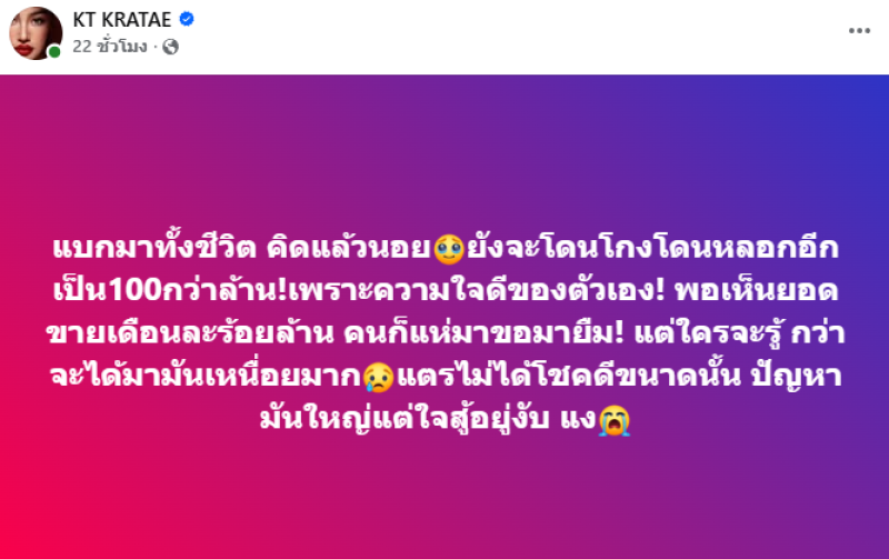 หลังจากนักร้องลูกทุ่งชื่อดัง กระแต อาร์สยาม ได้ออกมาเปิดใจผ่านโซเชียลหลังถูกโกงเงินจำนวนกว่า 100 ล้านบาท
