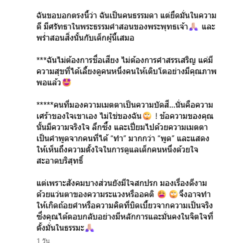 ฉันไม่ต้องการชื่อเสียง ไม่ต้องการคำสรรเสริญ แค่มีความสุขที่ได้เลี้ยงดูคนหนึ่งคนให้เติบโตอย่างมีคุณภาพ พอแล้ว คนที่มองความเมตตาเป็นความบัดสี นั่นคือความเศร้าของใจเขาเอง ไม่ใช่ของฉัน ข้อความของคุณนั้นมีความจริงใจ ลึกซึ้ง และเปี่ยมไปด้วยความเมตตา เป็นคำพูดจากคนที่ได้ทำ มากกว่า พูด
