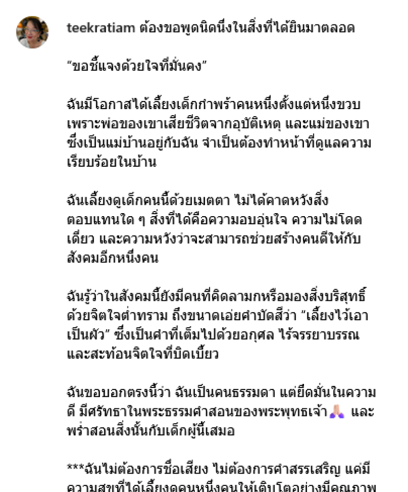 ฉันรู้ว่าในสังคมนี้ยังมีคนที่คิดลามกหรือมองสิ่งบริสุทธิ์ด้วยจิตใจต่ำทราม ถึงขนาดเอ่ยคำบัดสีว่า เลี้ยงไว้เอาเป็นผัว ซึ่งเป็นคำที่เต็มไปด้วยอกุศล ไร้จรรยาบรรณ และสะท้อนจิตใจที่บิดเบี้ยว ฉันขอบอกตรงนี้ว่า ฉันเป็นคนธรรมดา แต่ยึดมั่นในความดี มีศรัทธาในพระธรรมคำสอนของพระพุทธเจ้า และพร่ำสอนสิ่งนั้นกับเด็กผู้นี้เสมอ