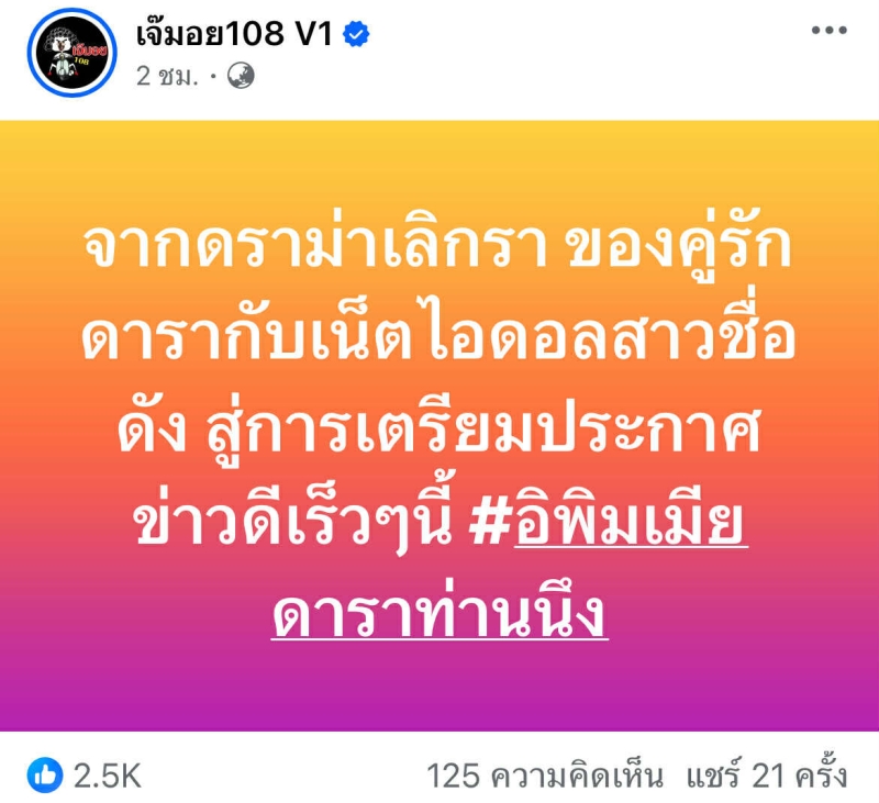โดย มีข้อความว่า จากความสัมพันธ์ที่เคยจบลงด้วยดราม่า สู่การกลับมาของ คู่รัก ที่พร้อมจะมีข่าวดีในอนาคต ซึ่งทำให้หลายคนเริ่มเดาไปต่างๆ นานาว่าจะเป็นคู่ไหนที่ เจ๊มอย กล่าวถึง