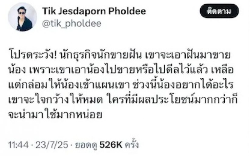 ล่าสุด ติ๊ก ได้ออกมาโพสต์ข้อความอีกว่า โปรดระวัง! นักธุรกิจนักขายฝัน เขาจะเอาฝันมาขายน้อง เพราะเขาเอาน้องไปขายหรือไปดีลไว้แล้ว เหลือแต่กล่อมให้น้องเข้าแผนเขา ช่วงนี้น้องอยากได้อะไรเขาจะใจกว้างให้หมด ใครที่มีผลประโยชน์มากกว่าก็จะนำมาใช้มากหน่อย