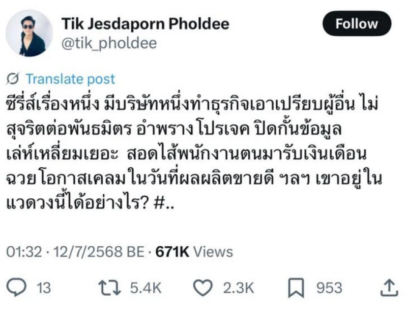 จากกรณีที่ก่อนหน้านี้ทางด้านนักแสดงหนุ่ม ติ๊ก เจษฎาภรณ์ ได้ออกมาโพสต์ว่า ซีรีส์เรื่องหนึ่ง มีบริษัทหนึ่งทำธุรกิจเอาเปรียบผู้อื่น ไม่สุจริตต่อพันธมิตร อำพรางโปรเจกต์ ปิดกั้นข้อมูล เล่ห์เหลี่ยมเยอะ สอดไส้พนักงานตนมารับเงินเดือน ฉวยโอกาสเคลมในวันที่ผลผลิตขายดี ฯลฯ เขาอยู่ในแวดวงนี้ได้อย่างไร