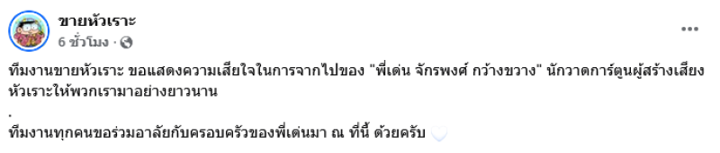 สร้างความโศกเศร้าให้กับแฟนๆการ์ตูนกันอย่างมาก เมื่อล่าสุดทางด้านเพจ ขายหัวเราะ ได้ออกมาแจ้งข่าวเศร้าว่า ทีมงานขายหัวเราะ ขอแสดงความเสียใจในการจากไปของ พี่เด่น จักรพงศ์ กว้างขวาง นักวาดการ์ตูนผู้สร้างเสียงหัวเราะให้พวกเรามาอย่างยาวนาน ทีมงานทุกคนขอร่วมอาลัยกับครอบครัวของพี่เด่นมา ณ ที่นี้ ด้วยครับ