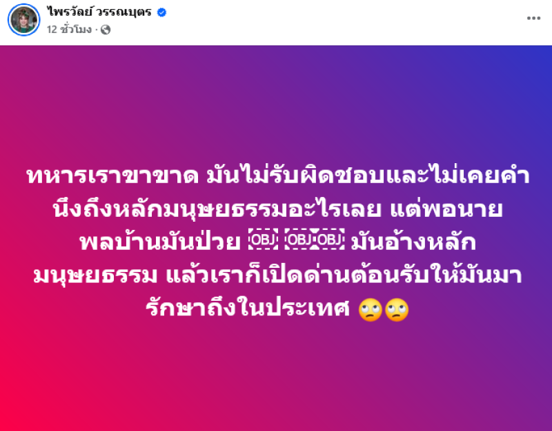 ทั้งนี้ทางด้าน แพรรี่ ไพรวัลย์ ได้ออกมาเคลื่อนไหวทันที ระบุว่า ทหารเราขาขาด มันไม่รับผิดชอบและไม่เคยคำนึงถึงหลักมนุษยธรรมอะไรเลย แต่พอนายพลบ้านมันป่วย มันอ้างหลักมนุษยธรรม แล้วเราก็เปิดด่านต้อนรับให้มันมารักษาถึงในประเทศ