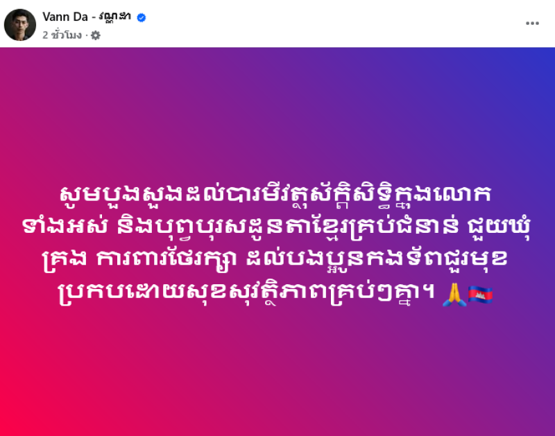 ขอพรบารมีสิ่งศักดิ์สิทธิ์ทั้งหลายในสากลโลก และบรรพบุรุษเขมร ทุกรุ่น ปกป้อง ปกป้องคุ้มครองพี่น้องกองทัพแนวหน้าให้ปลอดภัยและปลอดภัยด้วยเทอญ พร้อมอิโมจิไหว้ และธงชาติประเทศตนเอง ท่ามกลางแฟนๆเพลงในไทยต่างเข้ามาคอมเมนต์ผิดหวัง