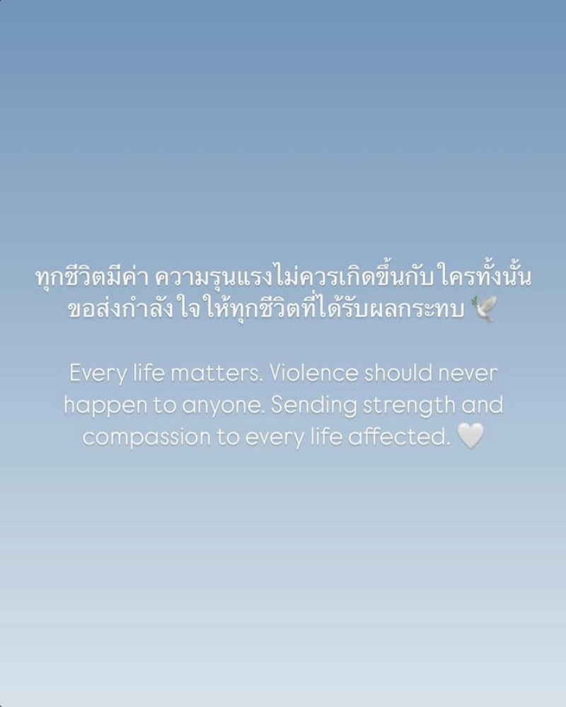 ทุกชีวิตมีค่า ความรุนแรงไม่ควรเกิดขึ้นกับใครทั้งนั้นขอส่งกำลังใจให้ทุกชีวิตที่ได้รับผลกระทบ Every life matters. Violence should never happen to anyone. Sending strength and compassion to every life affected. ซึ่งหลังจากที่ได้โพสต์ออกไป ชาวเน็ตกัมพูชาต่างเข้ามาคอมเมนต์กันอย่างมากมาย