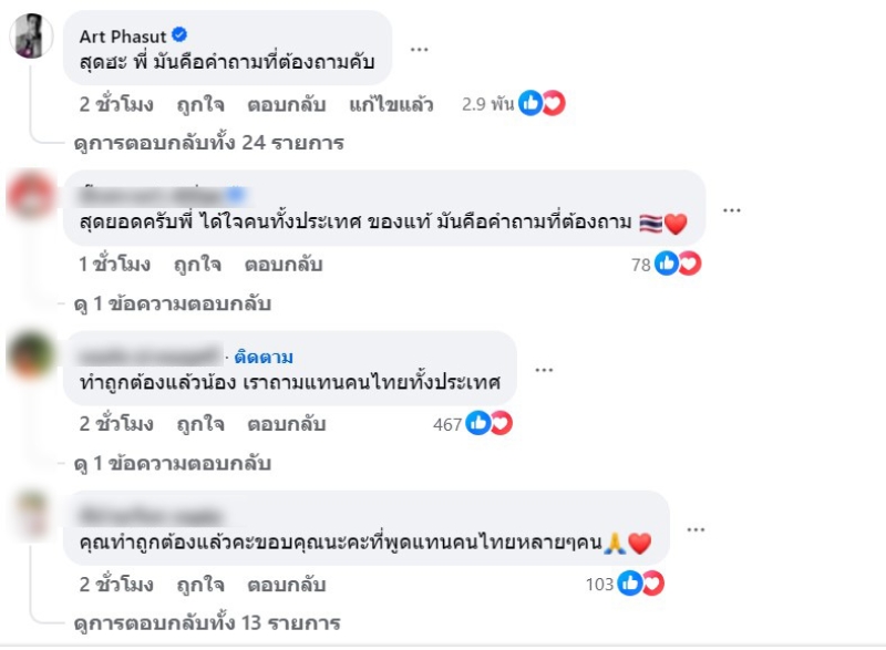 ท่ามกลาง ชาวเน็ตต่างเข้ามาคอมเมนต์เพียบ และด้าน อาร์ต พศุตม์ ก็เข้ามาคอมเมนต์ว่า สุดฮะ พี่ มันคือคำถามที่ต้องถามคับ ถูกใจแฟนๆเพียบ