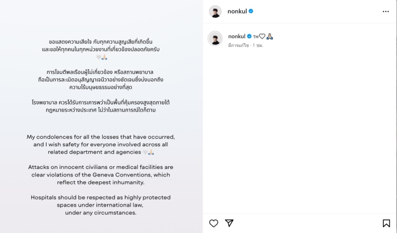 ขอแสดงความเสียใจ กับทุกความสูญเสียที่เกิดขึ้น และขอให้ทุกคนในทุกหน่วยงานที่เกี่ยวข้องปลอดภัยครับ การโจมตีพลเรือนผู้ไม่เกี่ยวข้อง หรือสถานพยาบาล ถือเป็นการละเมิดอนุสัญญาเจนีวาอย่างชัดเจนซึ่งบ่งบอกถึง ความไร้มนุษยธรรมอย่างที่สุด โรงพยาบาล ควรได้รับการเคารพว่าเป็นพื้นที่คุ้มครองสูงสุดภายใต้ กฎหมายระหว่างประเทศ ไม่ว่าในสถานการณ์ใดก็ตาม