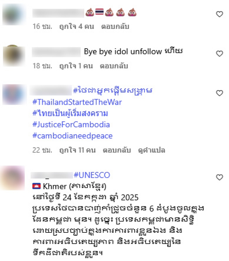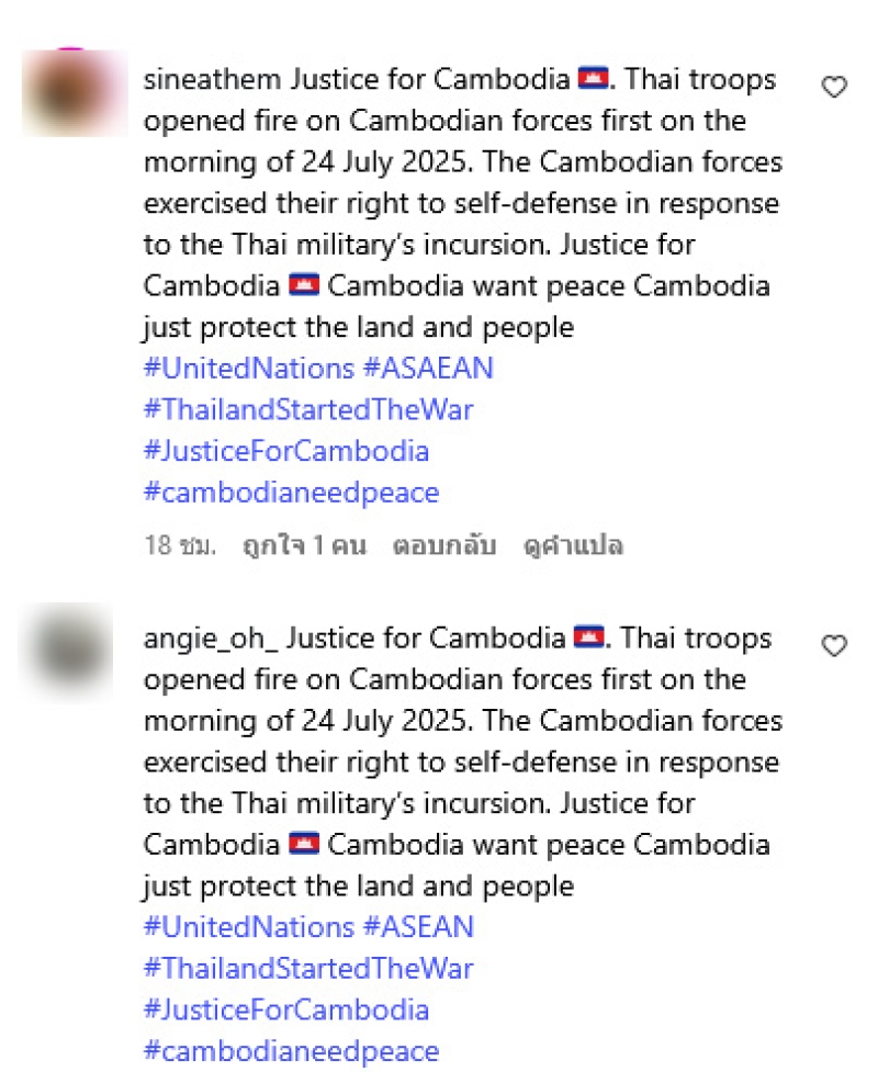 แต่ทั้งนี้เมื่อได้โพสต์ออกไปต่างมีชาวเน็ตกัมพูชาจำนวนมากบุกเข้ามาคอมเมนต์ถล่ม กล่าวหาว่าไทยเป็นฝ่ายเริ่มโจมตีก่อน พร้อมโต้กลับว่าการกระทำของกองทัพกัมพูชาเป็นเพียงการป้องกันตัว