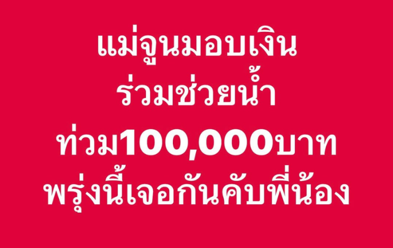 แม้จูนจะติดภารกิจ ไม่สามารถเดินทางไปกับสามีและทีมงานได้ แต่เธอก็ร่วมสนับสนุนเงิน 100,000 บาท พร้อมอาหารสด อาหารแห้ง และสิ่งของจำเป็น เพื่อให้เปิ้ลและทีมงานนำไปแจกจ่ายช่วยเหลือผู้ประสบภัยอย่างเต็มกำลัง