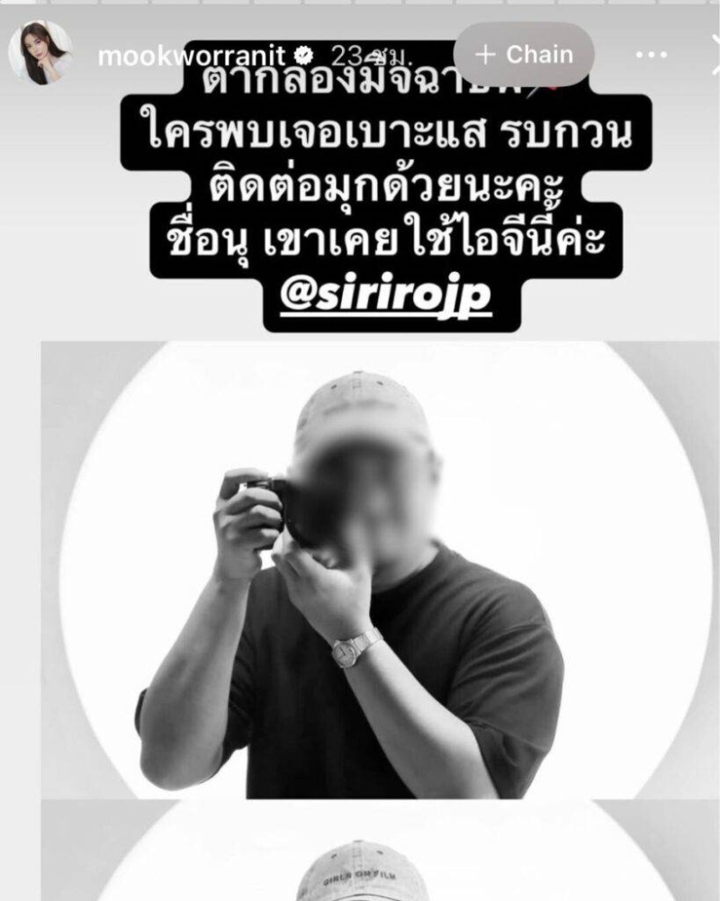 พร้อมกับเขียนข้อความว่า ตากล้องมิจฉาชีพ ใครพบเจอเบาะแส รบกวนติดต่อมุกด้วยนะคะ ชื่อนุ เขาเคยใช้ไอจีนี้ค่ะ @sirirojp