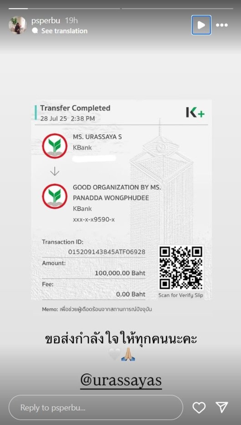 มูลนิธิองค์กรทำดี ของ บุ๋ม-ปนัดดา วงศ์ผู้ดี อีก 100,000 บาท สำหรับส่งต่อความช่วยเหลือไปยังผู้อพยพจากเหตุความไม่สงบบริเวณชายแดนไทย-กัมพูชา