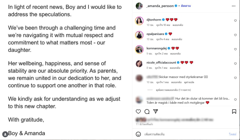 โดยทาง ออกมาพูดชัดแล้วถึงความสัมพันธ์ว่า ตามกระแสข่าวที่เกิดขึ้น อแมนดาและผมอยากขอใช้โอกาสนี้ชี้แจงเรื่องราวต่อทุกท่านครับ ช่วงเวลาที่ผ่านมาไม่ใช่เรื่องง่ายเลยสำหรับเราทั้งคู่ แต่เราจะพยายามก้าวผ่านไปให้ได้ และเราจะทุ่มเทเพื่อสิ่งสำคัญที่สุดในชีวิตของพวกเรา นั่นก็คือเฟรย่า ความสุข ความสบายใจ และความมั่นคงในชีวิตของลูกคือสิ่งที่เราปรารถนามากที่สุด เราจะยังคงร่วมกันทำหน้าที่พ่อและแม่ให้ดีที่สุด และจะคอยสนับสนุนกันละกันเพื่อดูแลให้ลูกเติบโตอย่างที่เราตั้งใจ ขอบคุณทุกความห่วงใยและหวังว่าจะได้รบความเข้าใจจากทุกคนในช่วงเวลานี้นะครับ บอย & อแมนดา