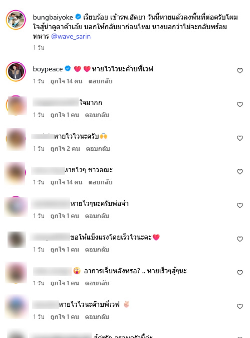 โดยเผยภาพขณะคุยกับเวฟ สาริน ที่กำลังแอดมิทโรงพยาบาล พร้อมข้อความระบุว่า "เรียบร้อย เข้ารพ. อัดยา วันนี้หายแล้วลงพื้นที่ต่อครับโผม ใจสู้น่าดูดาด้าเอ้ย บอกให้กลับมาก่อนไหม นางบอกว่าไม่จะกลับพร้อมทหาร