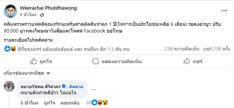 เรียกได้ว่า ทำเอาชาวเน็ตคอมเมนต์สนั่นเลยทีเดียว เมื่อล่าสุดทาง อ.อ๊อด วีรชัย ได้ออกมาอัปเดตคดีนี้อีกครั้ง โดยการโพสต์เฟซบุ๊กว่า คดีแพรวพราวแพ้คดีคุณเกริกนะครับศาลตัดสินจำคุก 1 ปี(ให้การเป็นประโยชน์เหลือ 6 เดือน) รอลงอาญา ปรับ 80,000 บาทลงโฆษณาในสื่อและโพสต์ Facebook ขอโทษ รายละเอียดโปรดติดตาม