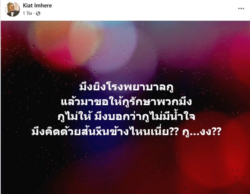 โดย ป๋ากิ๊ก ได้ออกมาพูดถึงประเด็นดังกล่าวผ่านทางเฟซบุ๊คKiat Imhere ระบุว่า xึงยิงโรงพยาบาลxู แล้วมาขอให้xูรักษาพวกxึง xูไม่ให้ xึงบอกว่าxูไม่มีน้ำใจ xึงคิดด้วยส้นxีนข้างไหนเนี่ย?? xู...งง??