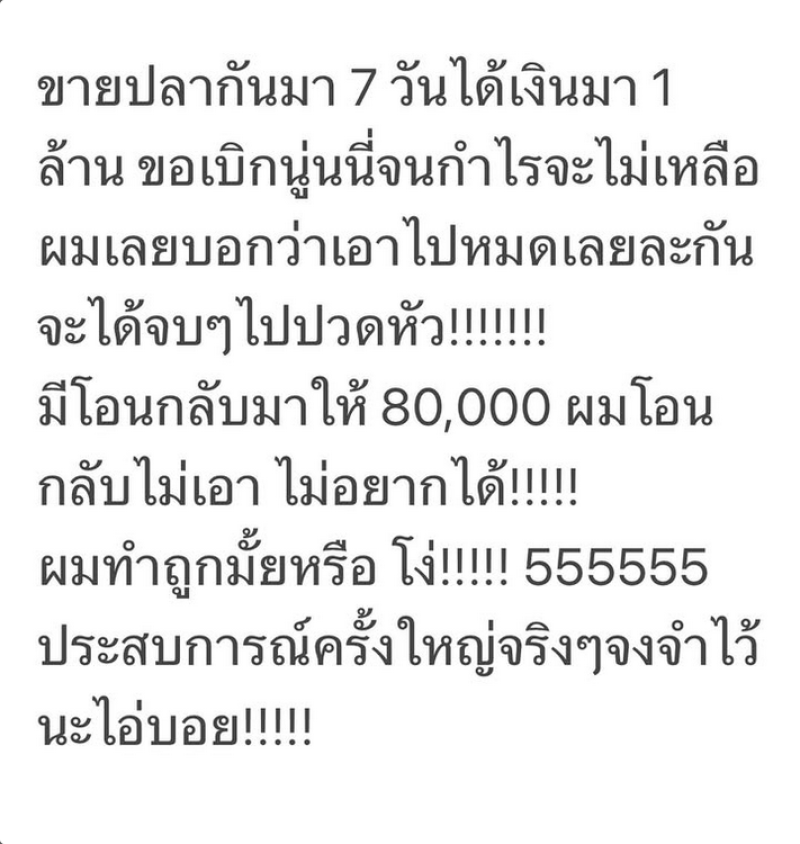 มีโอนกลับมาให้ 80,000 ผมโอนกลับ ไม่เอ่ ไม่อยากได้!!!!! ผมทำถูกมั้ย หรือโง่!!!!! 5555555 ประสบการณ์ครั้งใหญ่จริงๆ จงจำไว้นะไอ่บอย พร้อมทั้งเขียนแคปชั่นว่า ผมโง่มั้ย5555555 เสียงอิหอมลอยมา xึงอ่ะอิโง่!!!!!55555 ท่ามกลางคนในวงการต่างเข้ามาส่งกำลังใจกันเพียบ