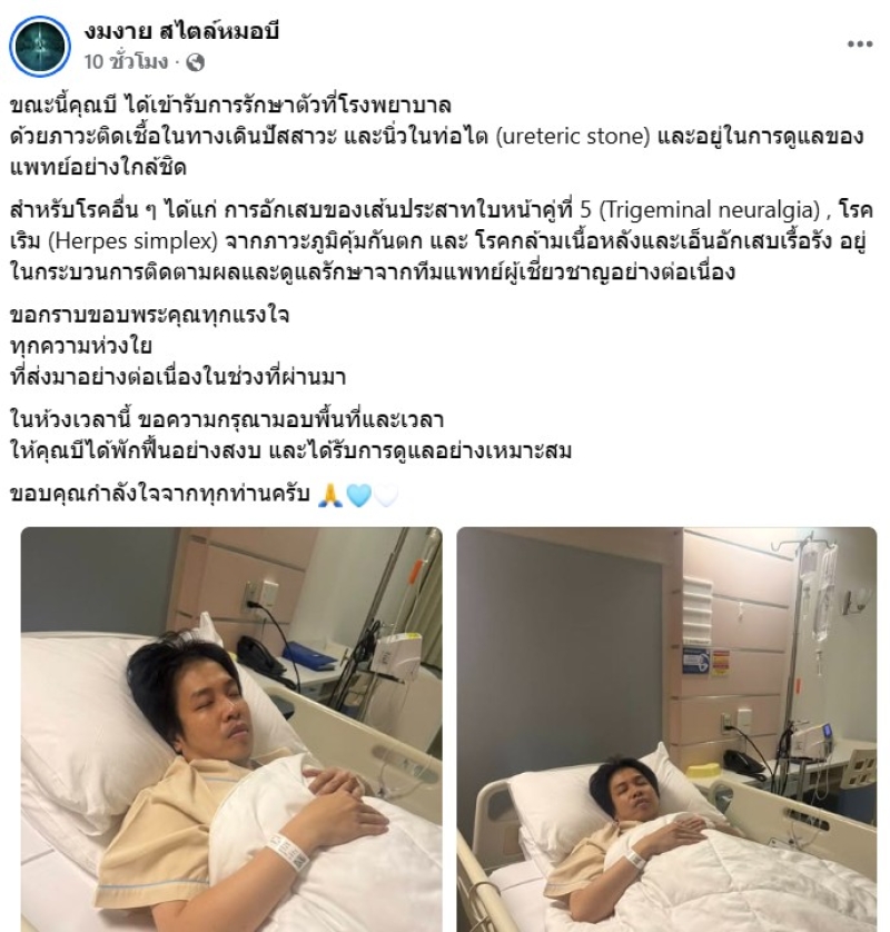 ล่าสุดเพจเฟซบุ๊ก งมงาย สไตล์หมอบี ได้โพสต์ข้อความแจ้งข่าวอาการป่วยของคุณบี หรือ หมอบี ที่ต้องเข้ารับการรักษาตัวในโรงพยาบาล เนื่องจากภาวะติดเชื้อในทางเดินปัสสาวะและนิ่วในท่อไต (Ureteric Stone) โดยคุณบีกำลังอยู่ในการดูแลของทีมแพทย์อย่างใกล้ชิด