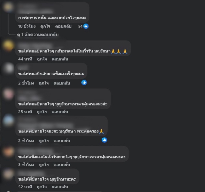 แฟน ๆ และผู้ติดตามจำนวนมากต่างร่วมกันส่งกำลังใจให้หายไว ๆ เช่น พักผ่อนเยอะ ๆ หายเร็ว ๆ นะคะ หรือ ขอให้ทุกอย่างผ่านไปด้วยดี มีแต่คนห่วงใยและรอให้คุณกลับมาแข็งแรงเหมือนเดิม