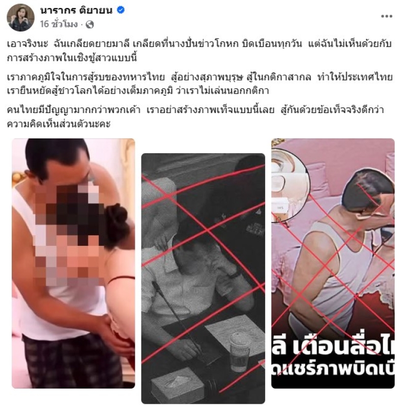 ล่าสุด ต๊ะ นารากร นักข่าวดัง ได้โพสต์ข้อความแสดงความเห็นถึงประเด็นนี้ว่า เอาจริงนะ ฉันเกลียดยายมาลี เกลียดที่นางปั่นข่าวโกหก บิดเบือนทุกวัน แต่ฉันไม่เห็นด้วยกับการสร้างภาพในเชิงชู้สาวแบบนี้