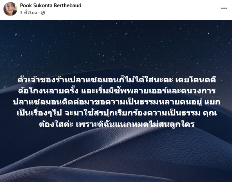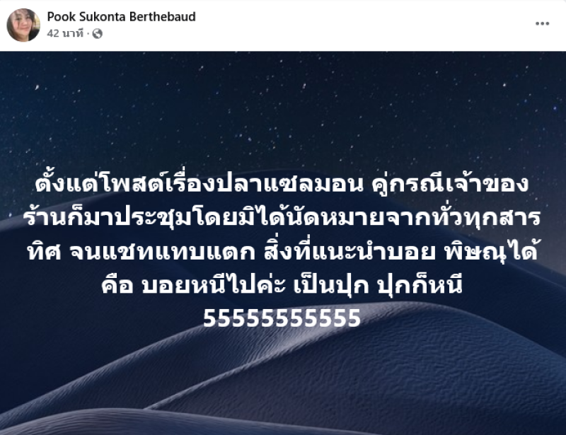 กลายเป็นประเด็นดราม่าเลยทีเดียว เมื่อทางด้านเพจPook Sukonta Berthebaud ได้ออกมาโพสต์เรื่องราวของเจ้าของร้านปลาแซลมอนที่ทำธุรกิจกับ บอย พิษณุ ในมุมของเจ้าของร้านที่อยากจะชี้แจงเรื่องดังกล่าวบ้าง โดยระบุว่า