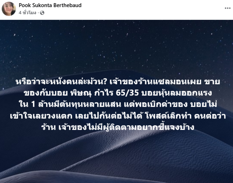 หรือว่าจะหนังคนล่ะม้วน? เจ้าของร้านแซลมอนเผย ขายของกับบอย พิษณุ กำไร 65/35 บอยหุ้นลมออกแรง ใน 1 ล้านมีต้นทุนหลายแสน แต่พอเบิกค่าของ บอยไม่เข้าใจเลยวงแตก เลยไปกันต่อไม่ได้ โพสต์เลิกทำ คนต่อว่าร้าน เจ้าของไม่มีผู้ติดตามอยากชี้แจงบ้าง