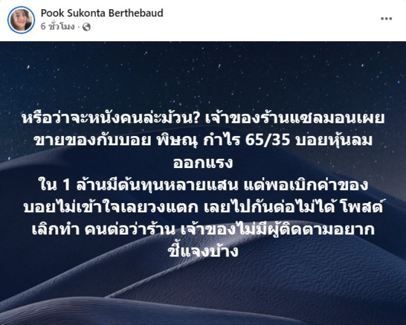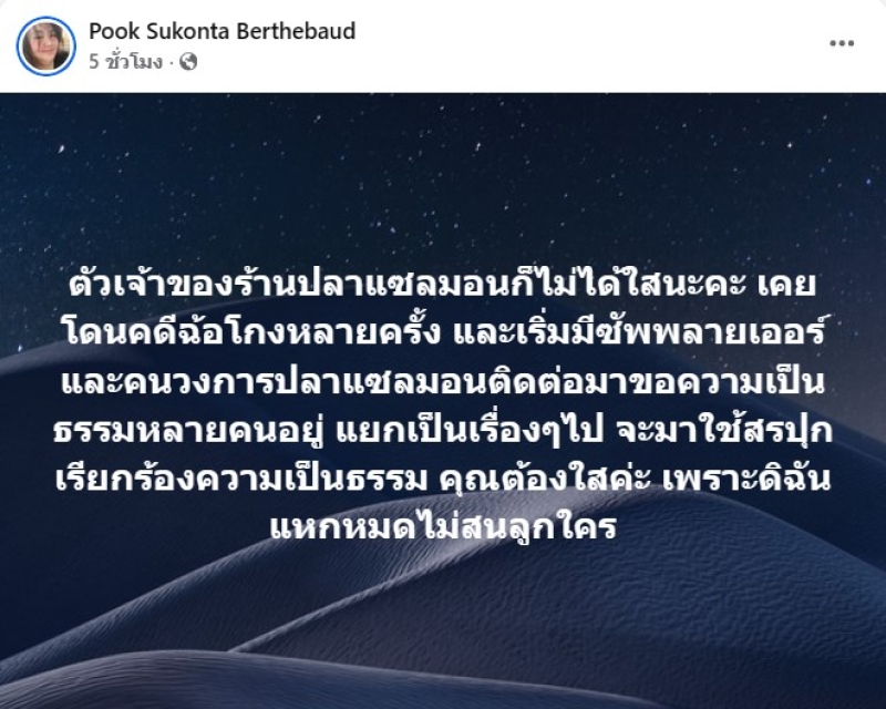 หลังจากนั้นไม่นานทาง Pook Sukonta Berthebaud ก็ได้โพสต์อีกว่า ตัวเจ้าของร้านปลาแซลมอนก็ไม่ได้ใสนะคะ เคยโดนคดีฉ้อโกงหลายครั้ง และเริ่มมีซัพพลายเออร์และคนวงการปลาแซลมอนติดต่อมาขอความเป็นธรรมหลายคนอยู่ แยกเป็นเรื่องๆไป จะมาใช้สรปุกเรียกร้องความเป็นธรรม คุณต้องใสค่ะ เพราะดิฉันแหกหมดไม่สนลูกใคร