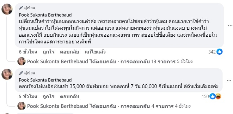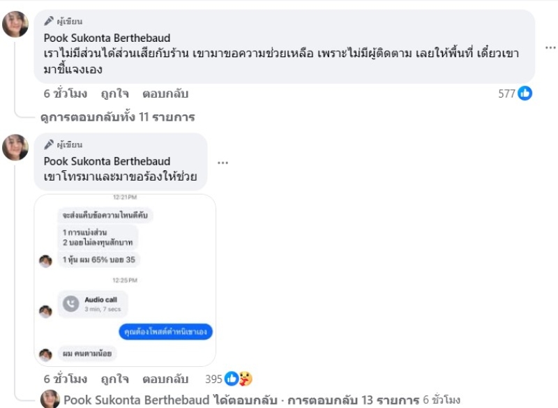 จากนั้น ยังเผยต่อในคอมเมนต์อีกว่า เราไม่มีส่วนได้ส่วนเสียกับร้าน เขามาขอความช่วยเหลือ เพราะไม่มีผู้ติดตาม เลยให้พื้นที่ เดี๋ยวเขามาชี้แจงเอง, เขาโทรมาและมาขอร้องให้ช่วย