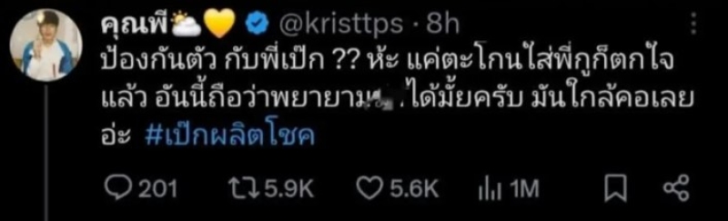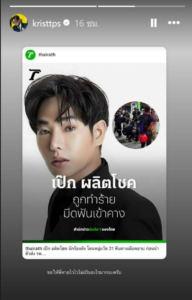 จากกรณีที่ก่อนหน้านั้น นักร้องดังอย่าง เป๊ก ผลิตโชค เกิดเหตุถูกทำร้ายด้วยอาวุธมีดเมื่อกลางดึก เวลา 01.43 น. ที่ปั๊มน้ำมันซอยรามคำแหง 76 สน.หัวหมาก โดยทางรุ่นน้องดาราอย่าง คริส พีรวัส ก่อนหน้านั้น ได้โพสต์ผ่าน X ว่า ป้องกันตัว กับพี่เป๊ก ห้ะ แค่ตะโกนใส่พี่กูก็ตกใจแล้ว อันนี้ถือว่าพยายาม x่า ได้มั้ยครับ มันใกล้คอเลยอ่ะ และทางคริสเอง ก็ยังได้แชร์ข่าวลงบนสตอรี่ไอจีด้วย