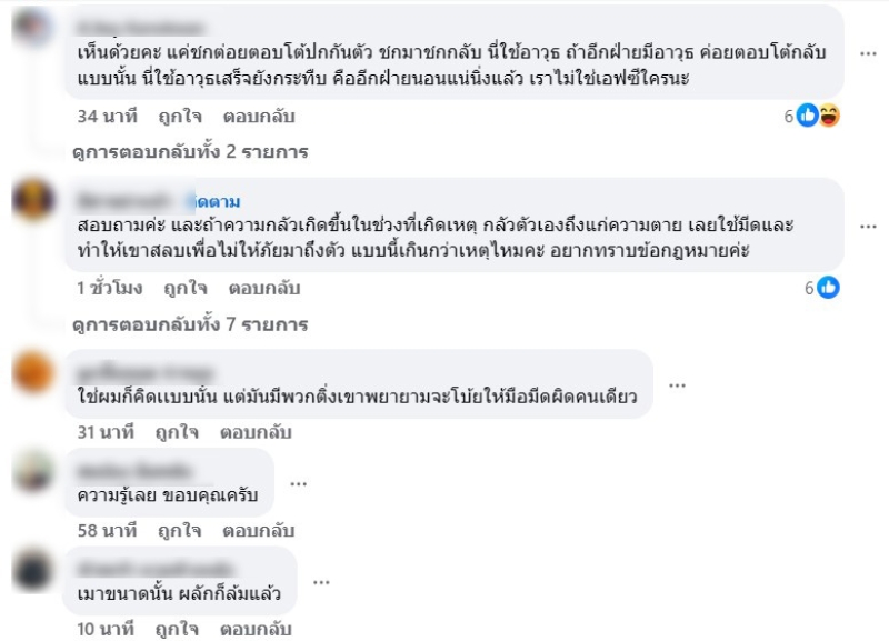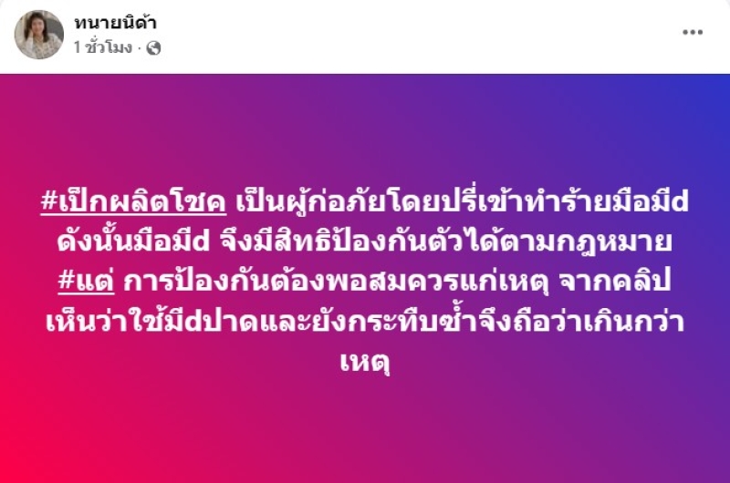 ล่าสุด ทางทนายดัง อย่าง ทนายนิด้า ได้ออกมาโพสต์เกี่ยวกับประเด็นดังกล่าวด้วย ว่า เป็กผลิตโชค เป็นผู้ก่อภัยโดยปรี่เข้าทำร้ายมือมีd ดังนั้นมือมีd จึงมีสิทธิป้องกันตัวได้ตามกฎหมาย แต่ การป้องกันต้องพอสมควรแก่เหตุ จากคลิปเห็นว่าใช้มีdปาดและยังกระทืบซ้ำจึงถือว่าเกินกว่าเหตุ