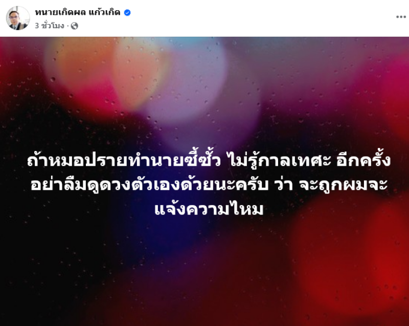 ผ่านทางเฟซบุ๊คทนายเกิดผล แก้วเกิด ระบุว่ ถ้าหมอปรายทำนายซี้ซั้ว ไม่รู้กาลเทศะ อีกครั้ง อย่าลืมดูดวงตัวเองด้วยนะครับว่า จะถูกผมจะแจ้งความไหม