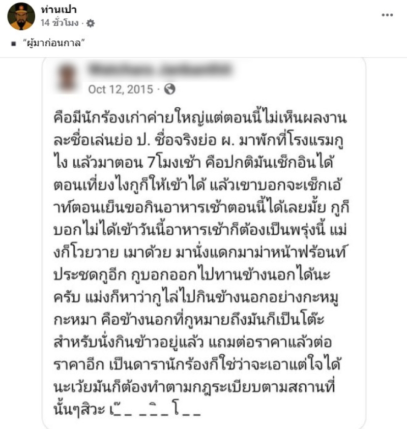เรียกได้ว่า มีการแชร์สนั่นโซเชียลอีกแล้ว เมื่อล่าสุดทางเพดดัง อย่าง ท่านเปา ได้ออกมาเผยผู้มาก่อนกาล หลังผู้ใช้เฟซบุ๊กรายหนึ่งแชร์ประสบการณ์ในปี 2015 เเฉนักร้องชายชื่อย่อ ป. เคยมาพักโรงแรมโดยเช็กอินตั้งแต่ 7 โมงเช้า ทั้งที่ยังไม่ถึงเวลา พร้อมขอรับอาหารเช้าทันที ทั้งที่ตั้งใจจะเช็กเอาต์ภายในวันเดียว