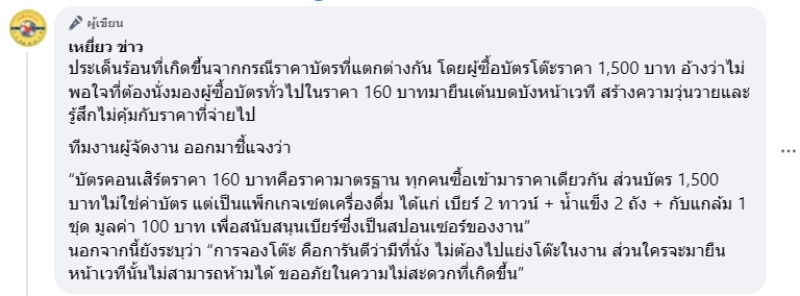 และทางเพจยังเผยอีกว่า ประเด็นร้อนที่เกิดขึ้นจากกรณีราคาบัตรที่แตกต่างกัน โดยผู้ซื้อบัตรโต๊ะราคา 1,500 บาท อ้างว่าไม่พอใจที่ต้องนั่งมองผู้ซื้อบัตรทั่วไปในราคา 160 บาทมายืนเต้นบดบังหน้าเวที สร้างความวุ่นวายและรู้สึกไม่คุ้มกับราคาที่จ่ายไป