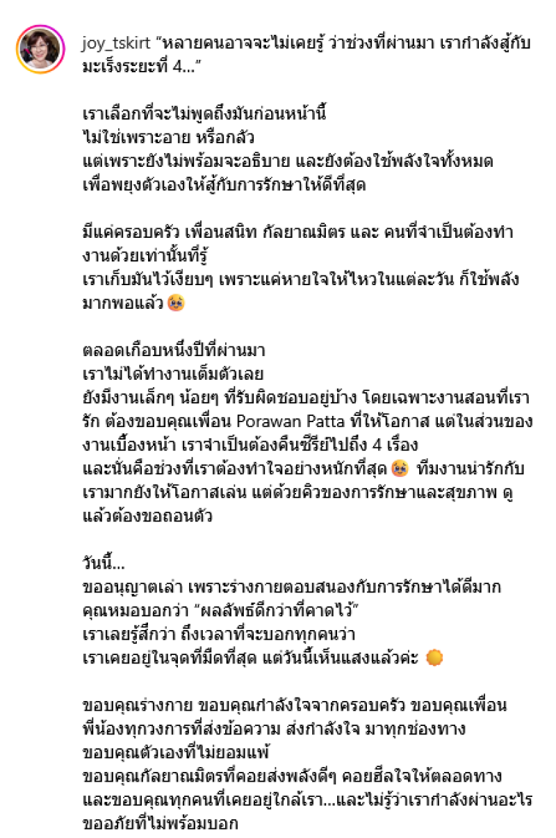 ทำเอาแฟนๆเเละเพื่อนในวงการต่างตกใจไม่น้อยสำหรับ จอย T-Skirt ที่ได้ออกมาแจ้งข่าวว่า กำลังสู้กับมะเร็งระยะที่ 4 ผ่านอินสตาแกรม joy_tskirt ระบุว่า หลายคนอาจจะไม่เคยรู้ ว่าช่วงที่ผ่านมา เรากำลังสู้กับมะเร็งระยะที่ 4 เราเลือกที่จะไม่พูดถึงมันก่อนหน้านี้ ไม่ใช่เพราะอาย หรือกลัว แต่เพราะยังไม่พร้อมจะอธิบาย