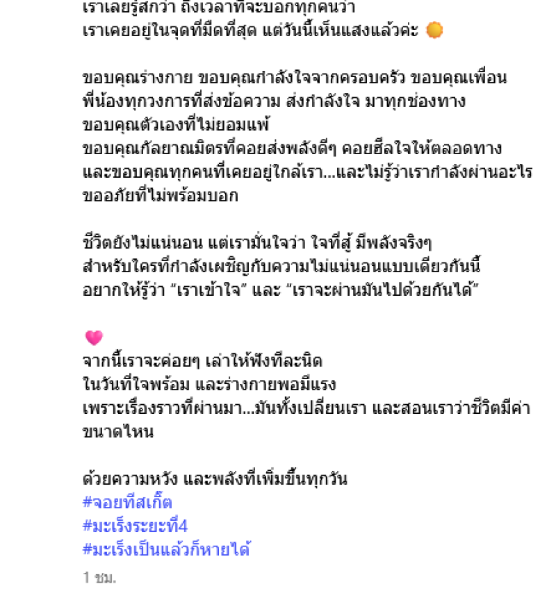 เราเลยรู้สึกว่า ถึงเวลาที่จะบอกทุกคนว่า เราเคยอยู่ในจุดที่มืดที่สุด แต่วันนี้เห็นแสงแล้วค่ะ ขอบคุณร่างกาย ขอบคุณกำลังใจจากครอบครัว ขอบคุณเพื่อนพี่น้องทุกวงการที่ส่งข้อความ ส่งกำลังใจ มาทุกช่องทาง ขอบคุณตัวเองที่ไม่ยอมแพ้ ขอบคุณกัลยาณมิตรที่คอยส่งพลังดีๆ คอยฮีลใจให้ตลอดทาง และขอบคุณทุกคนที่เคยอยู่ใกล้เรา...และไม่รู้ว่าเรากำลังผ่านอะไร ขออภัยที่ไม่พร้อมบอก